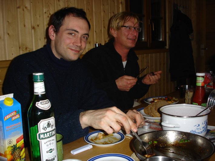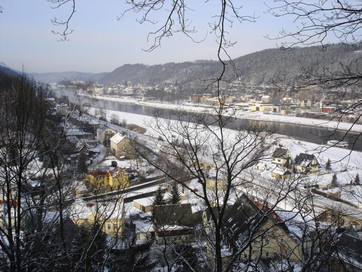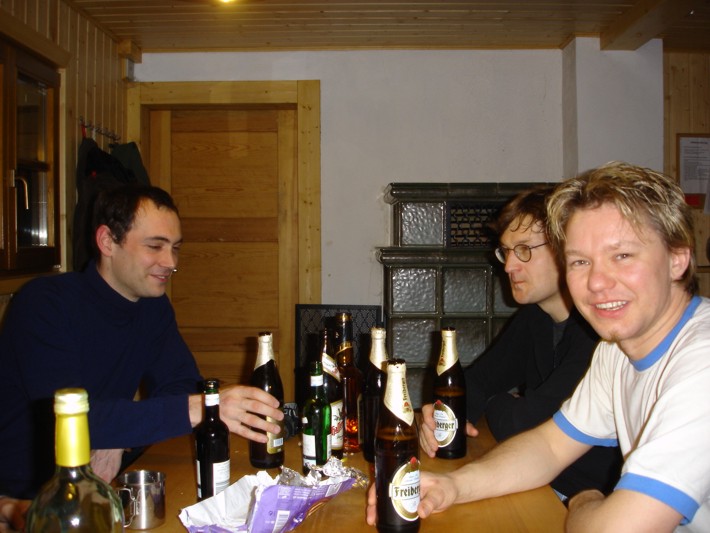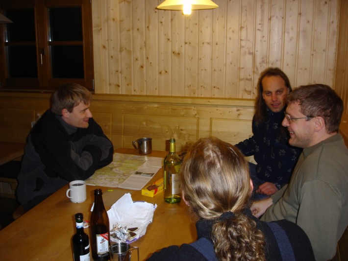 | Nach ausgiebigen Diskussionen und einigen Feuerzangenbowlenexperimenten war der Freitagabend endlich geschafft.... Der Samstagmorgen empfing uns mit trüben Himmel und Schneefall. Nach dem Frühstück machten wir uns auf die Socken nach Kleingießhübel. Nachdem wir der Zschirnsteinbaude einen unverhofften Umsatz beschert hatten, stapften wir bei aufklarendem Himmel mit kleinen Umwegen zurück zu unserer Unterkunft. |