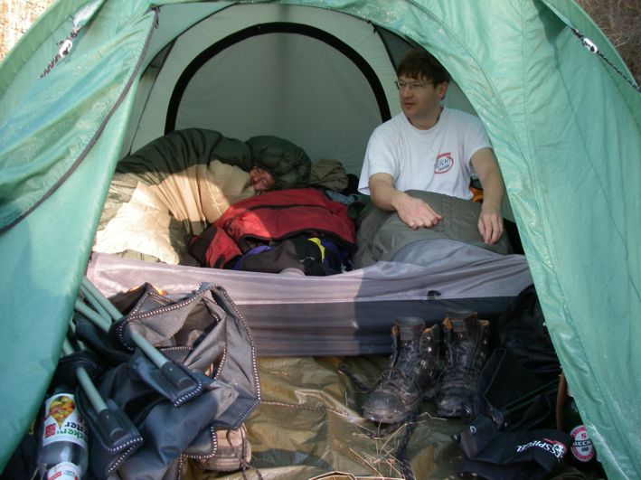 | Anfang Februar 2008 ging es in bewährter Art und Weise zum Winterzelten. Die Witterungsbedingungen waren optimal unserem Alter angepasst - tagsüber strahlender Sonnenschein und zweistellige Temperaturen und Nachts sternenklarer Himmel und Minusgrade mit gefrorenen Wasserkanistern. |