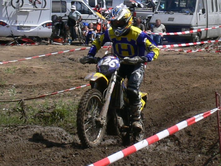 Etwas später als gewohnt, aber dafür in bewährter Qualität, hat die MSG Hannover im Juli 2008 zum traditionellen 3 Stunden Enduro Enduro in den Norden von Hannover eingeladen. Allen Unkenrufen zum Trotz begrüßte uns am Samstag wunderbarer Sonnenschein. Die Beregnung der Vortrage sorgte dafür, dass es nicht staubig wurde. Wie immer gab es wunderbares Endurogelände, aus den verfügbaren Fläche wurde das Maximale herausgeholt. Im Märchenwald und im Acker ging es dermaßen hin und her, dass man kaum noch wusste wo hinten und vorne ist, aber die eigendlichen Highlights waren wieder die beiden Sandgruben. Bernd hat Samstagnachmittag ein paar Bilder gemacht, die ich nicht vorenthalten will. Von den Kids und den Quads am Samstag und den Classikern und dem zweiten Lauf am Sonntag sowie der Weites des Geländes habe ich leider keine Fotos. |