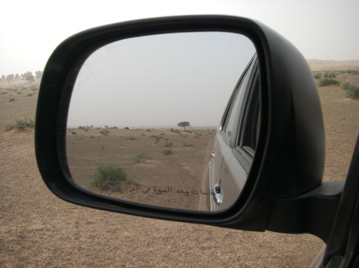 Zusammen geht es zurück zu Straße, denn wir müssen eine Polizeidienstelle suchen. In Dubai besteht die besondere Regelung, dass praktisch alle Unfälle der Polizei gemeldet werden müssen. Ohne Meldung ist keine Reparatur möglich und erst Recht keine Regulierung mit der Versicherung. Der naheliegende Ort hat zwar eine Moschee, aber ist so klein, das es natürlich keine Polizei gibt. Die schicken Häuser wirken wie ausgestorben, aber gerade als wir uns von dannen machen wollen, tritt ein Bewohner aus einem Haustor. Wir fragen nach dem Weg, aber auf der Karte kann er ihn uns (wie die meisten gefragten Dubaier) nicht zeigen. Aber da er sowieso in die Richtung will, fährt er einfach vorneweg. Nachdem wir die etwas zu stark flatternden Kunststoffteile fixiert haben (Merker: dran denken das nächste Mal Kabelstrapse einzupacken …), versuchen wir seinem Tempo zu folgen. Ab 120 km/h piepst der Temposensor dauerhaft – ob der wohl in privaten PKW's auch montiert ist? Dann braucht man einen gute Stereoanlage…… |