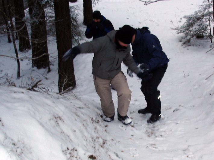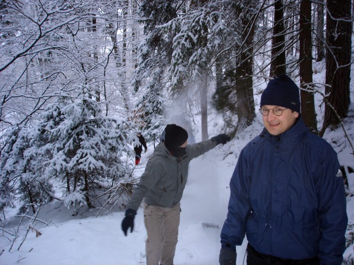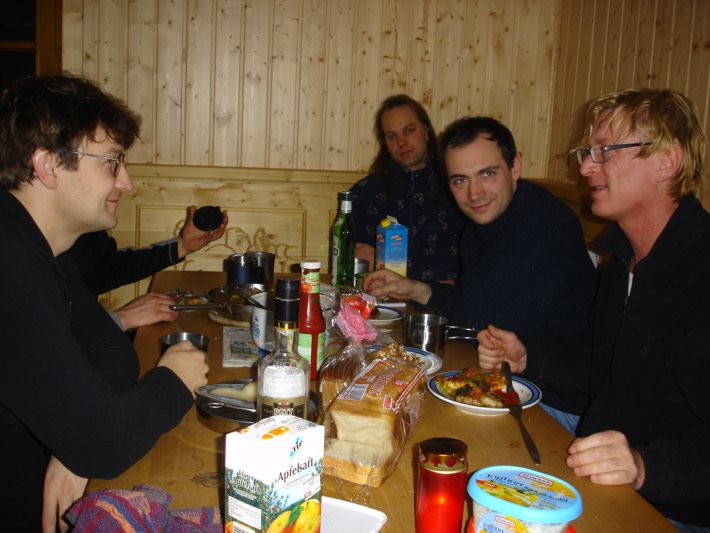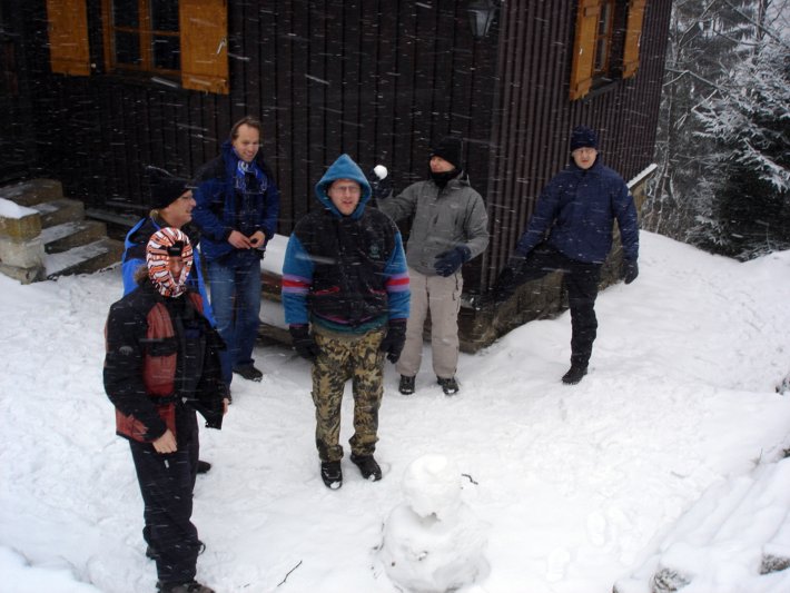 | Nach ausgiebigen Diskussionen und einigen Feuerzangenbowlenexperimenten war der Freitagabend endlich geschafft.... Der Samstagmorgen empfing uns mit trüben Himmel und Schneefall. Nach dem Frühstück machten wir uns auf die Socken nach Kleingießhübel. Nachdem wir der Zschirnsteinbaude einen unverhofften Umsatz beschert hatten, stapften wir bei aufklarendem Himmel mit kleinen Umwegen zurück zu unserer Unterkunft. |