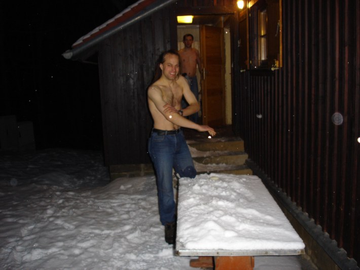 | Anfang Februar 2006 ging es zum Winterhausen ins Sächsische Elbsandsteingebirge nach Krippen. Dank Udos Unterstützung konnten wir für dieses Wochenende dekadent und komfortabel in der Hütte des ASD Dresden nächtigen. Mit elektrisch Licht und Kachelofen waren wir mit unserer Winterzeltausrüstung völlig overdressed. Nach wenigstens war der Schlafsaal im Obergeschoss unbeheizt und das Wasser musste an einer Quelle unten im Ort geholt werden ;o) |