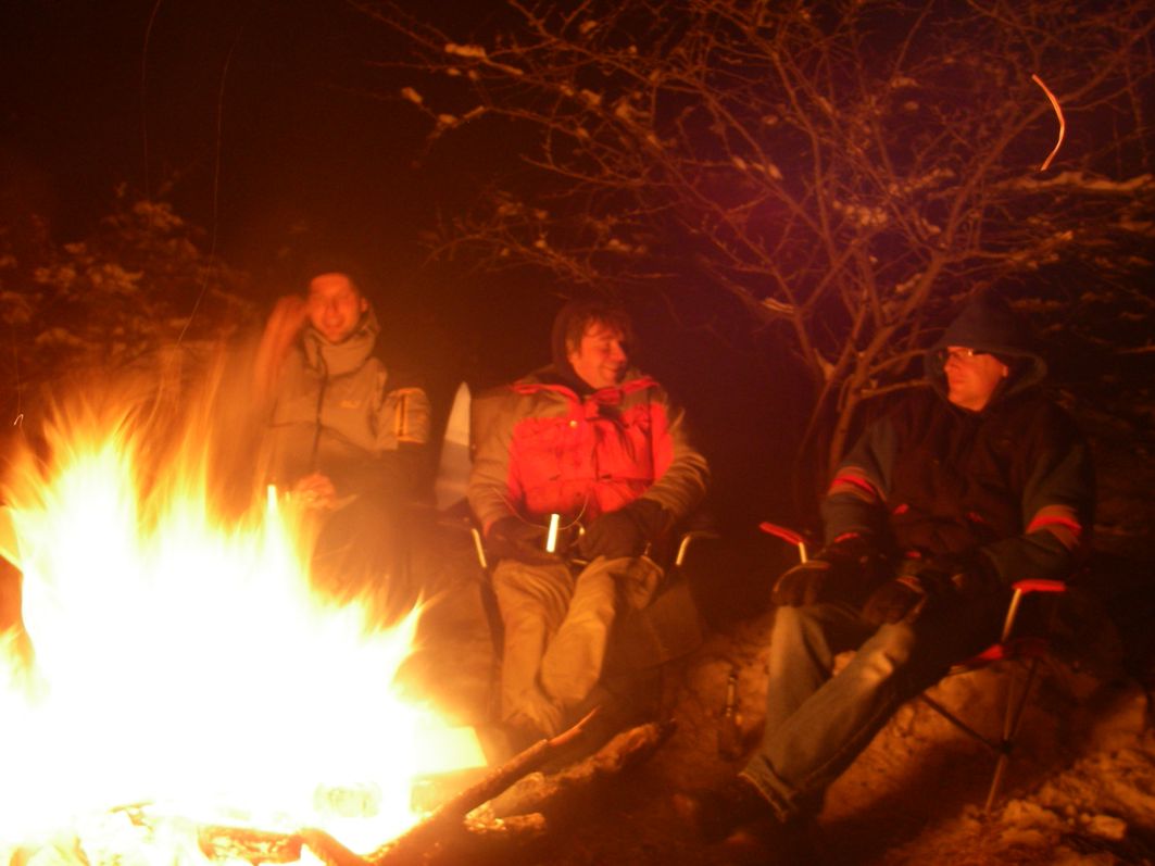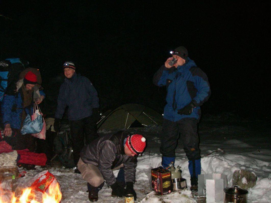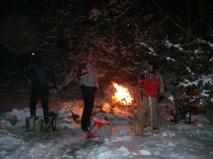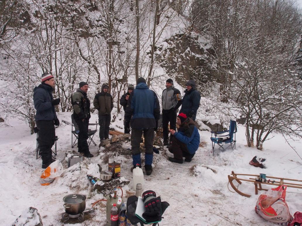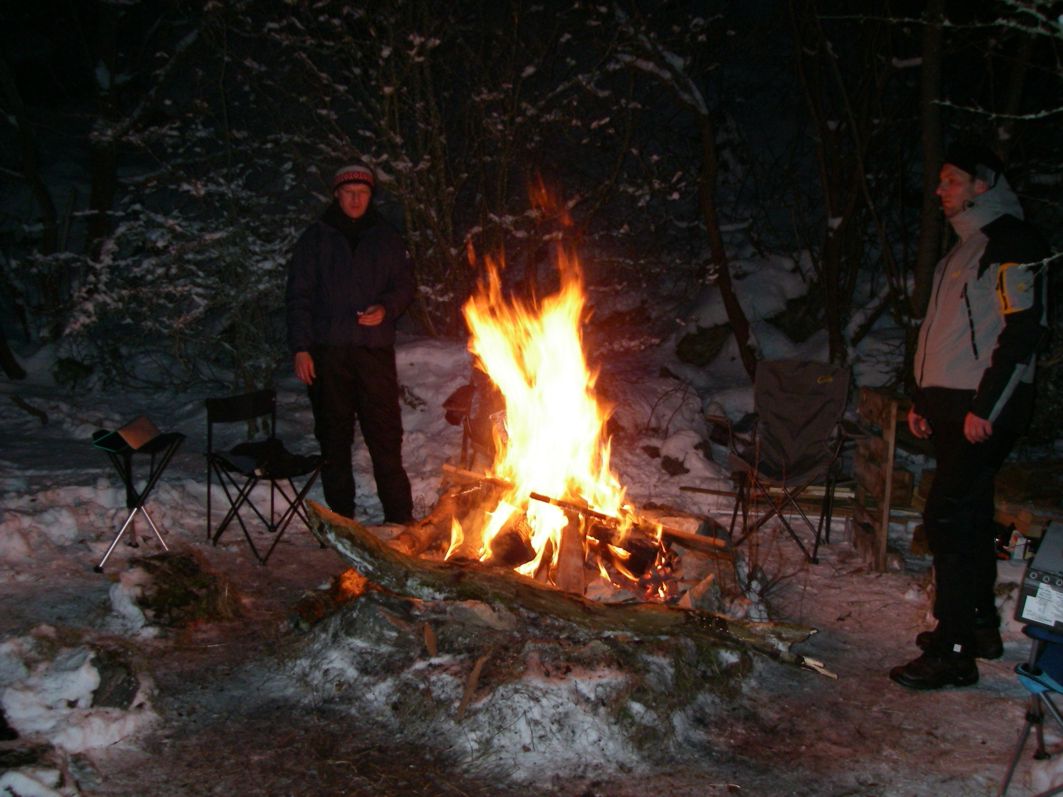 Am letzten Januarwochenende 2013 ging es mit „den alten Männern“ (O-Ton von Michas Sohnemann) zum traditionellen Winterzelten. Der Wettergott (alternativ auch der Wetterfrosch) meinte es gut mit uns, denn dieses Mal war die Welt bei knackigen zweistelligen Minustemperaturen in pulvrigen Schnee gehüllt. Nach 22 Uhr waren wir dann endlich komplett und konnte uns der weiteren inneren Durchwärmung widmen. Als bayrische Spezialität gab es Gulasch mit Spätzle und Preiselbeeren – zu der späten Stunde waren viele Bäuche allerdings schon gut gefüllt. |