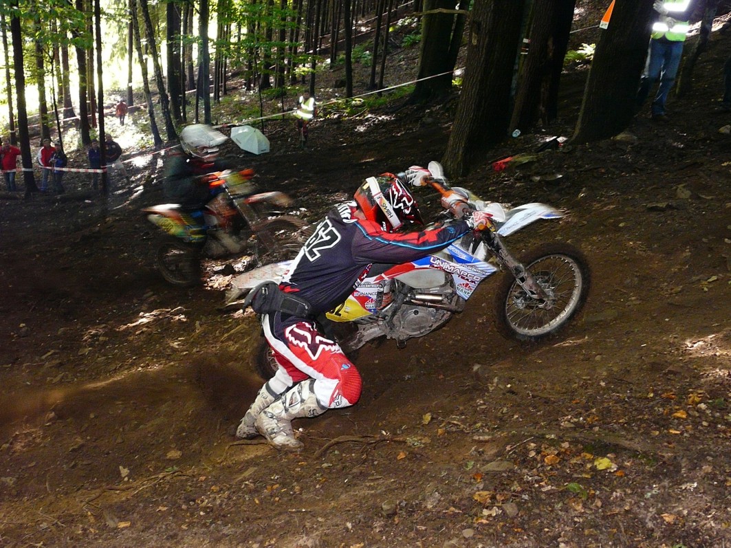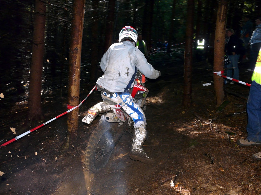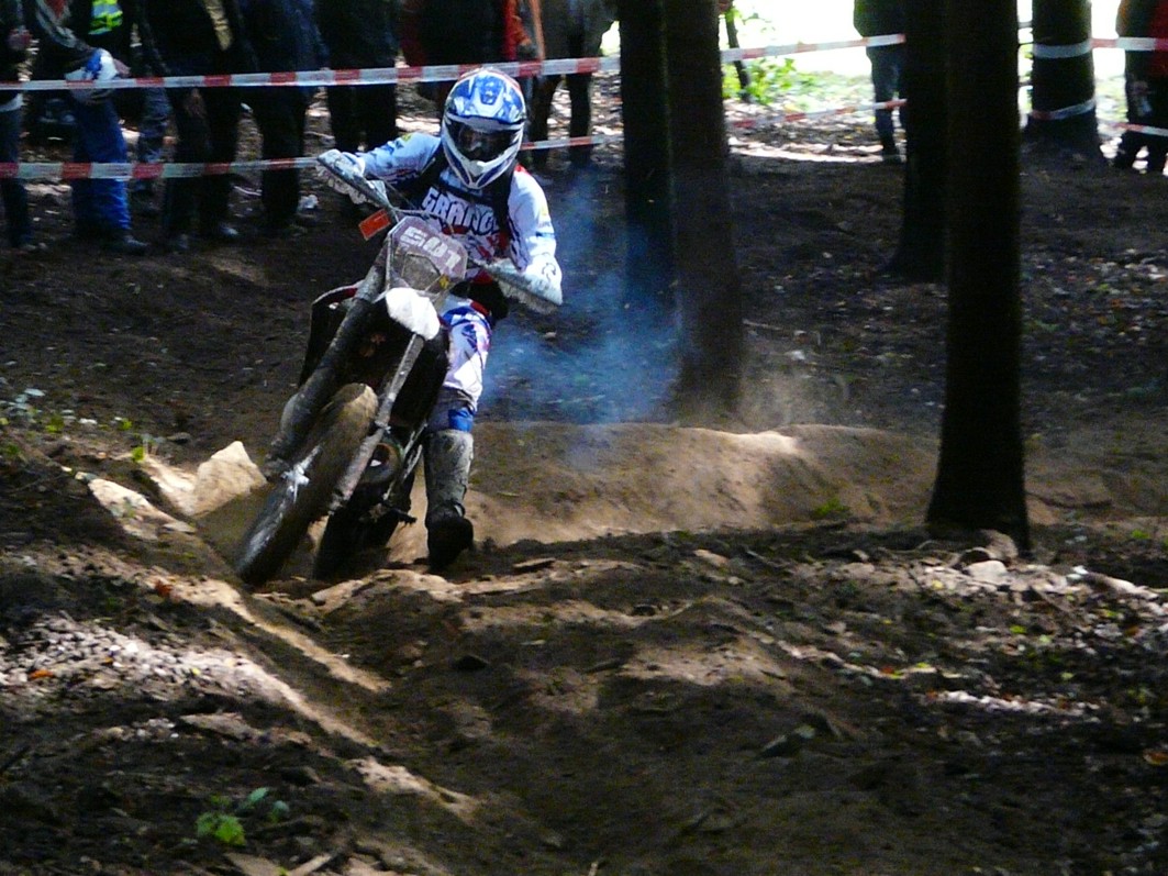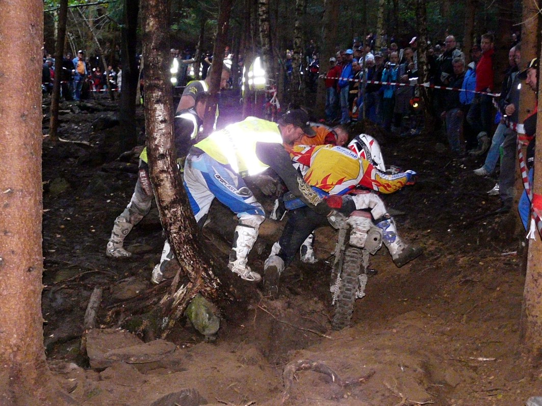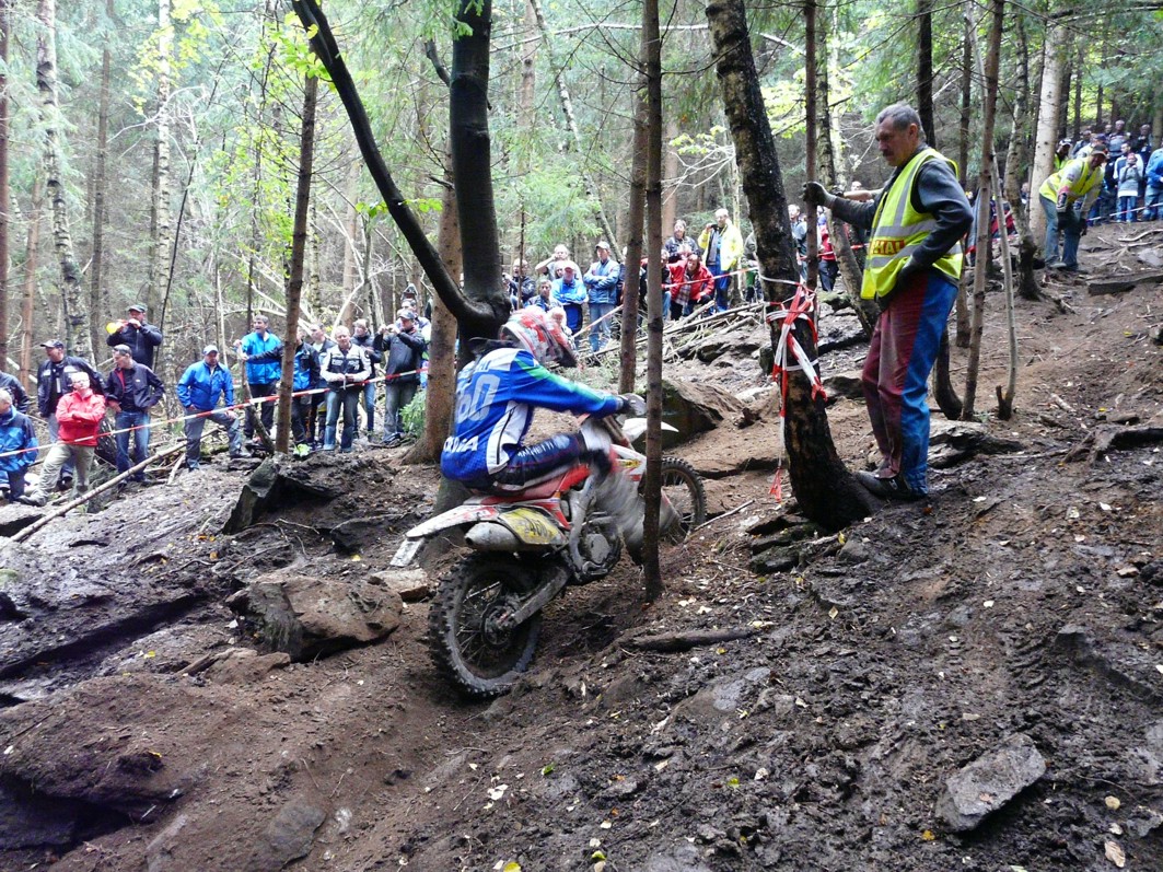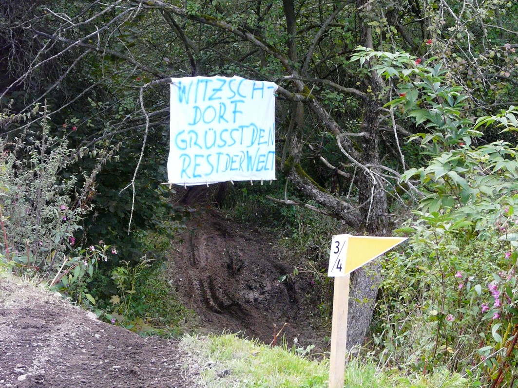 Offiziell nicht als Höhepunkt ausgewiesen, aber dank eines Interviews mit Markus Kehr und im Gespräch mit anderen Zuschauern publik geworden, erwies sich ein Wäldchen bei Witzschdorf als besonders lohnender Tipp. So ließen wir den Teufelsberg aus, der sowieso entschärft sein sollte. Zwar konnte man als Zuschauer in Witzschdorf schwer parken, aber die Enduroaktion an der felsigen Auffahrt in dem kleinen Wäldchen war vom feinsten. Während die Einen ohne jede Hilfe nach oben trialten, kamen Andere nur mit der geballten Hilfe der Streckenposten nach oben. Alles war gut organisiert und im richtigen Moment wurde die Streckenführung geändert. Die Euphorie der Zuschauer trieb die Fahrer nach oben – und insbesondere die südländischen Fahrer ließen sich oben kräftig feiern. |