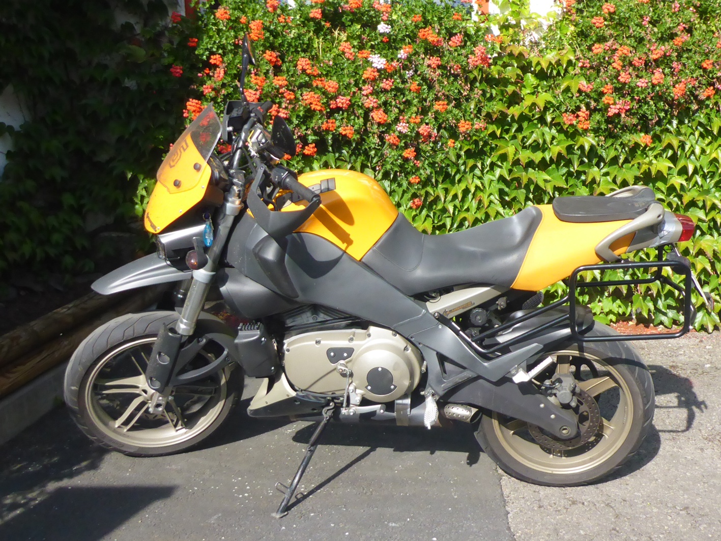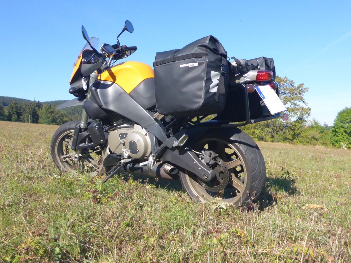 September 2018: Die Kilometer pro Jahr werden weniger, aber die 40 Tkm Grenze ist fast geknackt. Noch immer zaubert mir die Buell ein Lächeln ins Gesicht und eine echte Alternative ist mir trotz Probefahrten (Ducati Scrambler Desert Sled und 1100) noch nicht über den Weg gelaufen. Dafür habe ich reisemäßig aufgerüstet. Zuerst gönnte ich mir die Enduristan Monsoon 3 Gepäcktaschen, dann kam noch der Touratech Gepäckträger dazu. Arbeit zieht halt Arbeit nach sich, denn ohne den Gepäckträger hielten die Taschen nicht wirklich. |