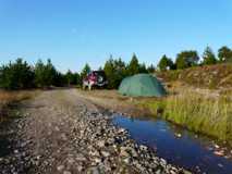 einen Platz auf dem Zeltplatz finden. Der Platz ist gerade abgetrocknet,