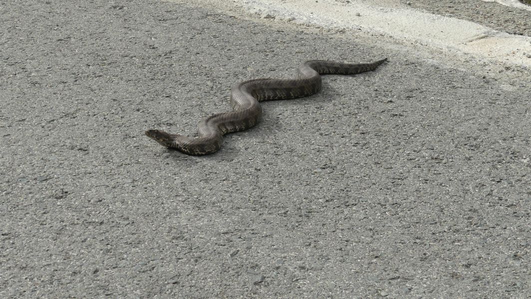 Diese rund 1,5 m lange Schlange haben wir beim Nachmittagsschlaf auf der Hauptstraße gestört. Zum Glück (für sie) waren wir auf der einsamen Straße im Cruising - Mode unterwegs und konnten rechtzeitig anhalten. Große Dankesbekundungen bekamen wir nicht, etwas unwirsch schlängelte sie von dannen. |