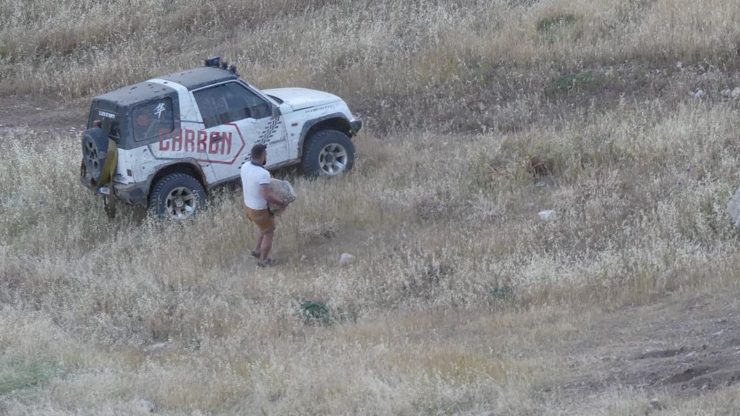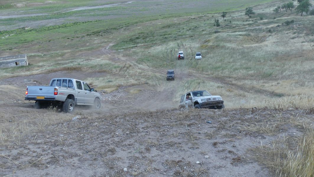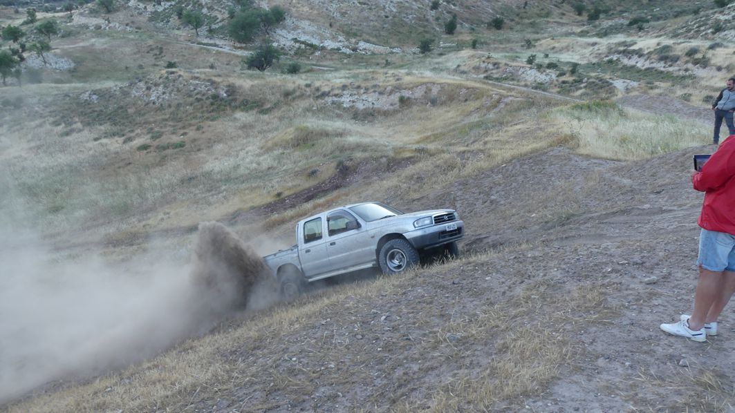Das verlassene Dörfchen Foinikas führte uns direkt in die erste Reihe eines besonderen Spektakels. Schon auf der Fahrt dorthin fiel uns der befahrene Hang auf, dass er wirklich zum 4x4 Hillclimben genutzt wurde, konnten wir kurze Zeit später feststellen. Während wir noch die verlassenen Häuser erkundeten, näherten sich von mehreren Seiten die Allradler. Da sie anscheinend alle das gleiche Ziel hatten, fuhren wir auch in die Richtung. Eine Gruppe russischstämmiger Einheimischer versuchten den Berg zu erklimmen, dem Gewinner winkte eine Flasche Whiskey. Wir wurden in dem bunten Treiben aufgenommen und staunten, was alles geht oder eben auch nicht geht. Da es langsam dunkel wurde, konnten wir nicht herausbekommen, ob die Flasche Hochprozentiger noch ihren Meister gefunden hat. |