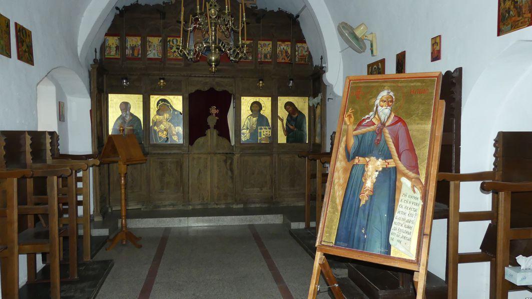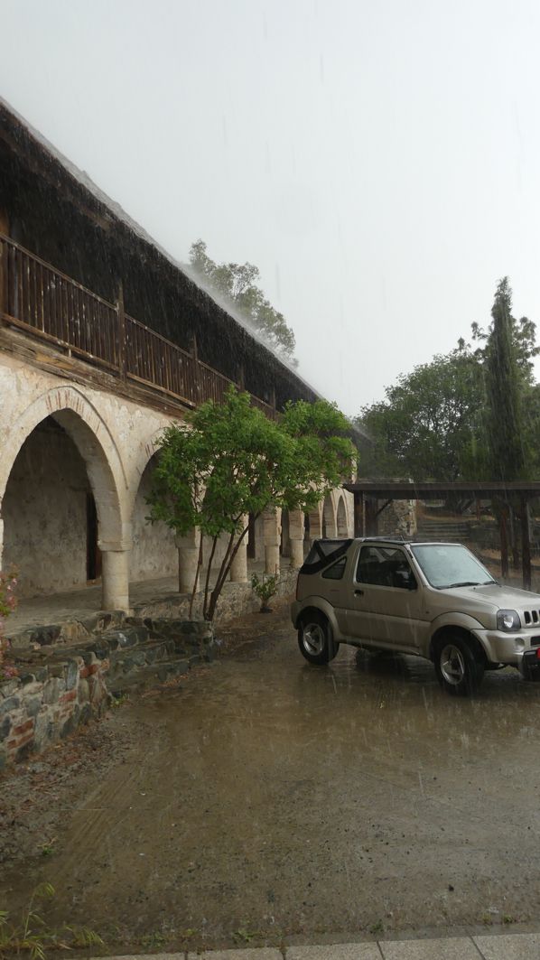 Als weiters fallen die Kirchen ins Auge. Ein besonderes Exemplar, welches für uns die perfekte Symbiose aus einsamer Natur mit ein wenig Lost Place Feeling hat, finden wir bei der Suche nach dem Cache "Vavatsinia Series #3 - Cave (Moutti tis Athashas)". Durch Zufall kommen wir an der Kirche "Moni Profitis" vorbei und just in diesem Moment bricht ein gewaltiger Wolkenbruch vom Himmel. Angesichts unserer profillosen Reifen "flüchten" wir in das Gotteshaus, niemand ist weit und breit zu sehen, nur ein einsames Grablicht zeugt von der kürzlichen Anwesenheit von Mitmenschen. Während draußen der Regen prasselt und die Blitze zucken, durchstreifen wir andächtig die gut erhaltene Kirche und den mitgenommenen Anbau. |