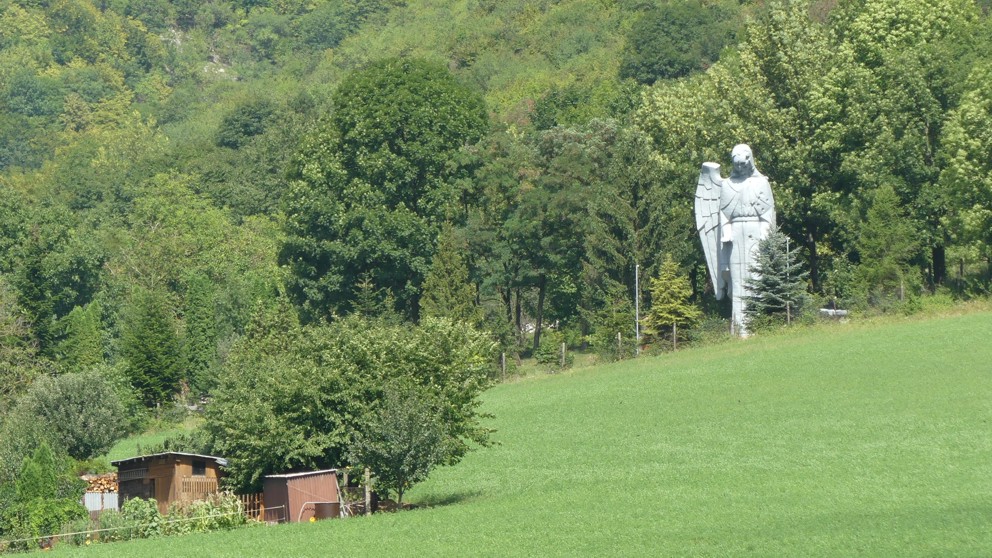 wartet ein riesiger vom Filmdreh übriggebliebener Engel (Ranený