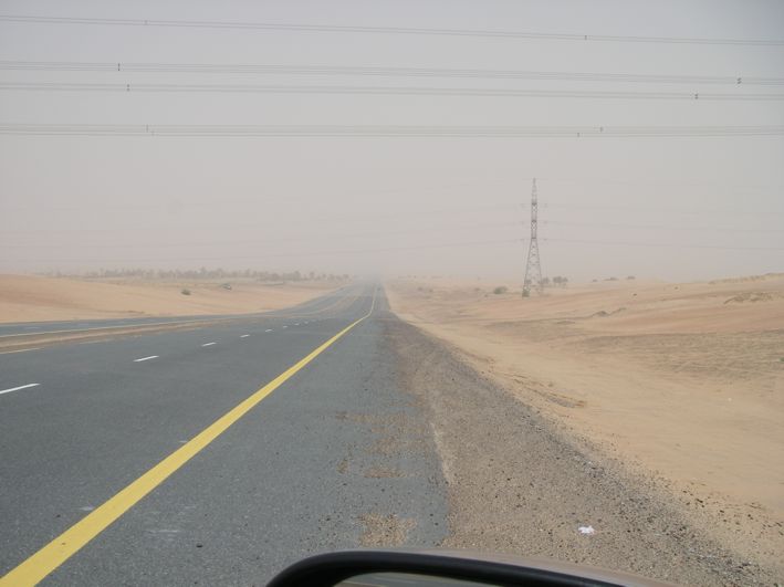 Zusammen geht es zurück zu Straße, denn wir müssen eine Polizeidienstelle suchen. In Dubai besteht die besondere Regelung, dass praktisch alle Unfälle der Polizei gemeldet werden müssen. Ohne Meldung ist keine Reparatur möglich und erst Recht keine Regulierung mit der Versicherung. Der naheliegende Ort hat zwar eine Moschee, aber ist so klein, das es natürlich keine Polizei gibt. Die schicken Häuser wirken wie ausgestorben, aber gerade als wir uns von dannen machen wollen, tritt ein Bewohner aus einem Haustor. Wir fragen nach dem Weg, aber auf der Karte kann er ihn uns (wie die meisten gefragten Dubaier) nicht zeigen. Aber da er sowieso in die Richtung will, fährt er einfach vorneweg. Nachdem wir die etwas zu stark flatternden Kunststoffteile fixiert haben (Merker: dran denken das nächste Mal Kabelstrapse einzupacken …), versuchen wir seinem Tempo zu folgen. Ab 120 km/h piepst der Temposensor dauerhaft – ob der wohl in privaten PKW's auch montiert ist? Dann braucht man einen gute Stereoanlage…… |