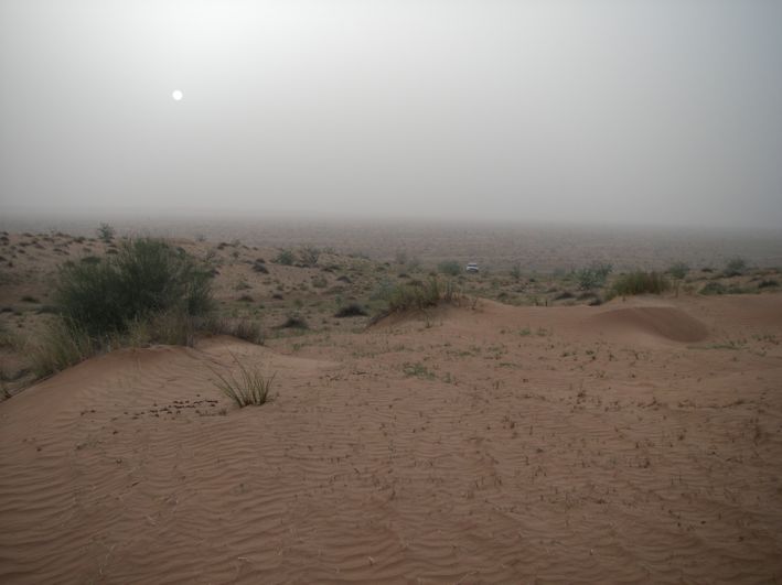 Am nächsten Morgen machen wir uns frohen Mutes auf den Weg Richtung „Fossile Rock“ (zwischen Al Awir und Maleihah = Route 16 aus „dem Buch“). Alles läuft super und die ersten Kamele kreuzen unsere Spuren. Scheinbar ist ganz Dubai offroad unterwegs, es ist Freitag und damit der Sonntag des Landes – überall kreisen ATV's, Moppeds und Geländewagen über die Pisten und Dünen. |