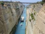 Anfangs durch Olivenhaine fahren wir weiter in Richtung Korinth. Die bekannteste Sehenswürdigkeit ist zweifellos der 1893 fertiggestellte Kanal von Korinth. Ein Parkplatz und ein paar Imbissbuden verraten seinen Standort. Seine fast senkrechten Felswände und die spielzeughafte Durchfahrt von Schiffen sind beeindruckend. |