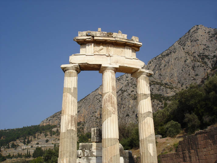 Am späteren Nachmittag treffen wir in Delphi ein. Am Südhang des Parnass – Gebirges gelegen gilt Delphi mit Recht als eine der landschaftlich reizvollsten antiken Stätten. Hier besteht eine perfekte Symbiose zwischen der Bergwelt und einer antiken Stätte. Das bekannte Orakel des Apollon galt insbesondere in der Zeit vom 8. bis 4. Jahrhundert vor Christi als Mittelpunkt der Welt der Griechen. Durch doppeldeutige, und damit meist zutreffende Antworten, wurde das Orakel bekannt. Die Vielzahl von Durchreisenden brachten immer wieder neue Informationen und machten den Ort zum Zentrum eines dichten Informationsnetzes (www gab‘s ja noch nicht...). Im 19. Jahrhundert wurde die antike Stätte von französischen Archäologen wiederentdeckt und mit teils rustikalen Methoden (inklusive Feldbahngleisen) ausgegraben. Angeblich sind dadurch mehr Schäden als in den Jahrhunderten davor entstanden, aber dem Erlebnis des weniger kundigen Besuchers tut das keinen Abbruch. |