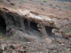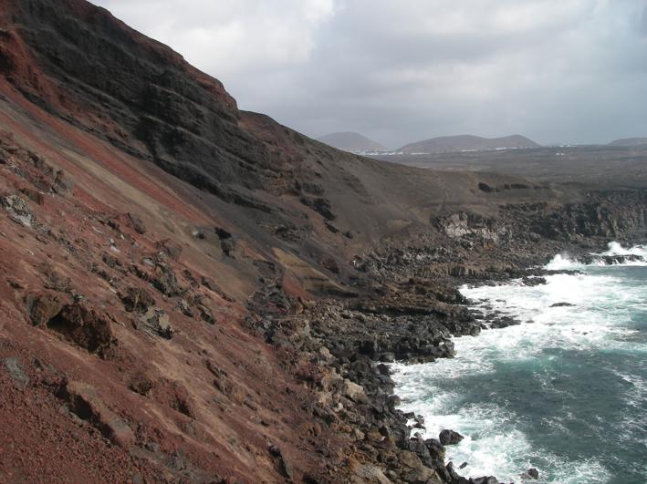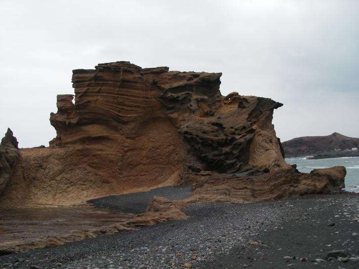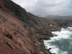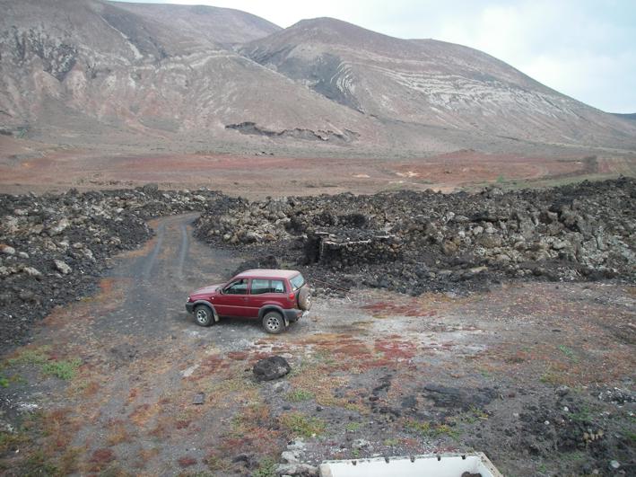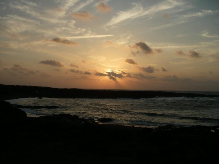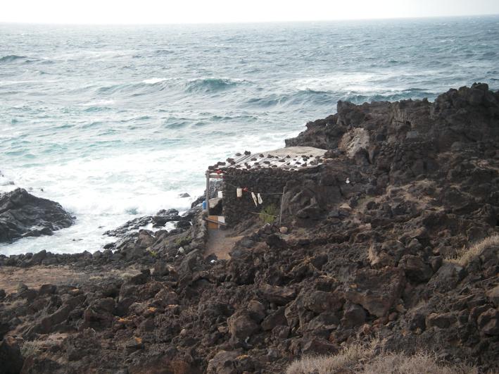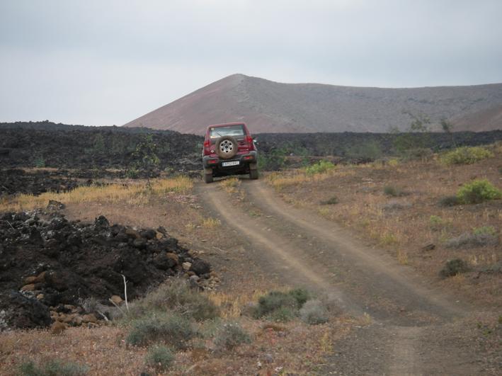 Unweit von La Santa liegt direkt am Meer ein weiterer erloschener Vulkan. Bei der kleinen und natürlich windigen Wanderung um den Montana Bermeja finden wir nicht nur faszinierende Gesteinsformationen, sondern auch eine Art Grotte für Aussteiger. Die Bewohner sind gerade nicht zu Hause, aber ein paar Wasserflaschen und eine Feuerstelle zeugen von einer Nutzung. Auch hierher verirren sich einzelne Sportler von der Urbanizacion La Santa Sport und sind verblüfft hier ein paar Wanderer, also sich eher langsam bewegende Leute, zu treffen. Nach der Bewegung auf zwei Beinen geht es weiter in 4WD L. Über spitze Steine kriechen wir durch ein Gesteinsfeld zum Plaja del Sol und finden uns irgendwann nach ein paar Kilometer Asphalt und einer Erdpiste durch ein gewaltiges Lavafeld am Playa de la Madera wieder. Der romantische Sonnenuntergang klappt zwar wegen vieler Wolken nicht ganz, aber ideal wäre der Platz schon. Nur ganz einsam ist es hier nicht, denn Angler mit Badelatschen, großen Kühltaschen und noch viel größeren Angeln versuchen zwischen den spitzen Steinen den besten Platz zum Fischen zu finden. |