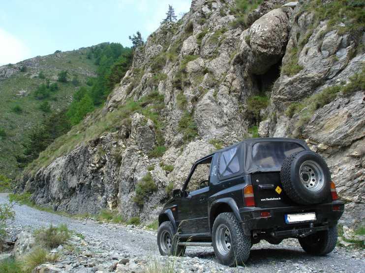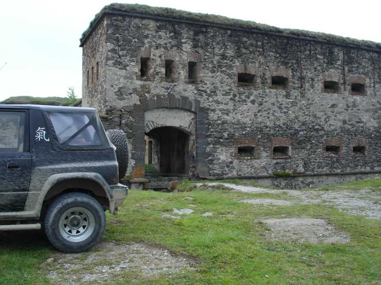 Donnerstag, 09.06.2005 - Tende Auf der Ligurischen ging zurück nach La Brigue und dann nach Tende zum Mittagessen im Ortszentrum. Gerade im Einstieg der Schotterpisten fühlte man sich gegenüber den einheimischen Fahrern selbst mit einem soften Vitara leicht overdressed. Die Südseite des Tendepasses führte uns über ein wenig Asphalt und viel Schoter zum Fort Central. Wie viele vor uns erkundeten wir das innere des alten Militärbaus. In einer kurzen Pause konnte ich den verdrehten Schalthebel des Verteilergetriebes wieder ausrichten. So konnten wir ohne 4WD die über 250 km zum Lago Maggiore abspulen. |