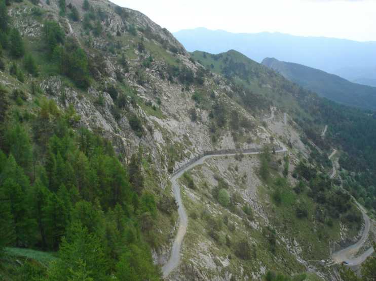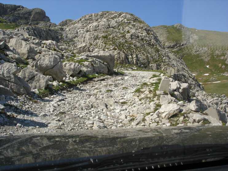 Mittwoch, 08.06.2005 - Ligurische Grenzkammstraße Von der Küsten ging es über Pigna zum südlichen Einstieg der Ligurischen Alpen Grenzkamm Höhenstrasse (Denzel 437). An der der Colla Melosa geht die Asphaltstrasse in Schotter und ein rot - weisses Schild (= Haftungsverzicht) führt in ein "Offroadwanderparadies". Bisher kannte ich die Strasse nur von Berichten - aber die Vielfalt der Strecken ist größer als nur felsiger Untergrund. Einige Höhlen und alte Militärbauten laden zum erkunden ein und der waldige Abschnitte wechseln sich mit steilen Hängen ab. Echte Hindernisse gibt es nicht, aber es macht Spass langsam durch die Landschaft zu hoppeln und dank der Vorsaison die relative Einsamkeit zu geniessen. |
