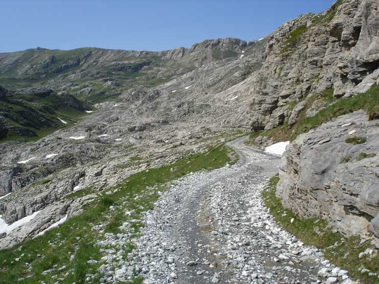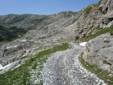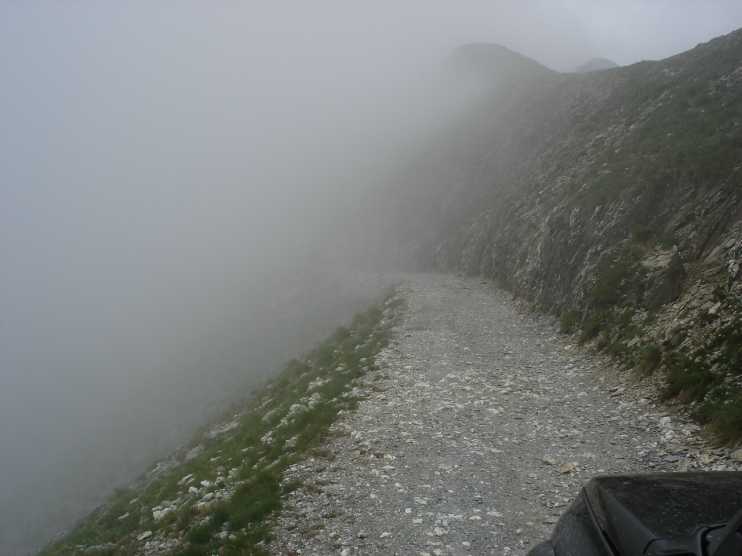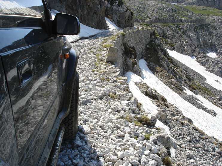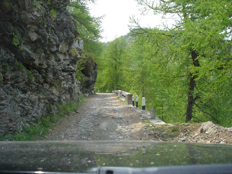 Ein Stück hinter dem Col de Seigneurs (2111 m) und einer schweisstreibenden Schipperei in einem Einschnitt schauten wir uns nach weiteren Schneehindernissen den Weg Richtung Fort Central an. Mittlerweile fehlten auch die Motorradspuren. Ein Befahren des Colle Malaberghe war bei den Schnemassen noch unmöglich, schade - damit wurde nichts aus der Erstbefahrung 2005. | |||