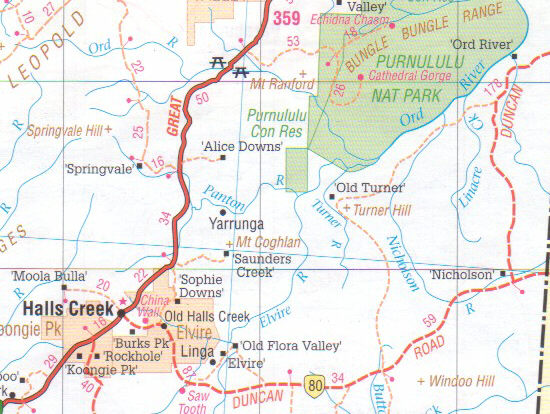 Wir haben eine "Mission" und wollen/müssen es in vier Wochen von Perth nach Darwin "schaffen". Doch das hält uns nicht davon ab statt des direkten und eintönigeren Weges über den Highway Number One eine südlicher Route über Halls Creek und die Duncan Road zu wählen. Auf der Karte nur gestrichelt - nichts wie hin. Normale Strassen können wir auch zu Hause haben, unser Bushcamper von Toyota mit sattem 4,2 l Saugdiesel warten nur auf den Offroad - Teil! Dank dem an fast jedem Roadhouse erhältlichen guten Kartenmaterial (z.B zur Übersicht von Hema Maps: Australia Road Atlas) findet man hier fast jede kleinste Piste. Was man als Mitteleuropäer kaum glauben kann - wenn in den Detailkarten auf den nächsten 50 Meilen kein Weg eingezeichnet ist, dann geht auch auf den nächsten 50 Meilen kein Weg ab! |