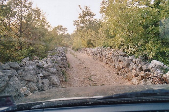 auf so einem Weg - wir wären mindestens viergeteilt worden. Auf der Staatstrasse 32 geht es Richtung Delnice und auf der 502 Richtung Kraljevica. Tankstellen sind hier dünn gesät und wir kullern gemütlich durchs Land. Eine Polizeikontrolle prüft nur unsere Fahrzeugpapiere und den Führerschein, unseren Grenzübertritt nach Kroatien hat wohl noch niemand verraten ;o) In Kraljevica gibt es Geld am Automaten und Sprit an der Tanke. Über die mautpflichtige Brücke (15 Kuna) und rumplige Strassen fahren wir zu unseren Zeltplatz in Punat auf die Insel Krk. Den spaßigen Tag lassen wir bei einer guten Karaffe Wein und einer riesigen Pizza beim Italiener der Stadt ausklingen. |