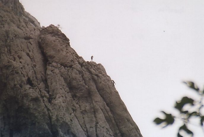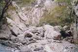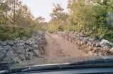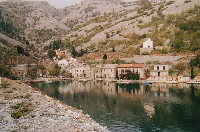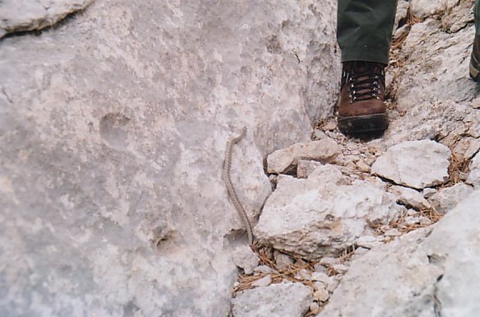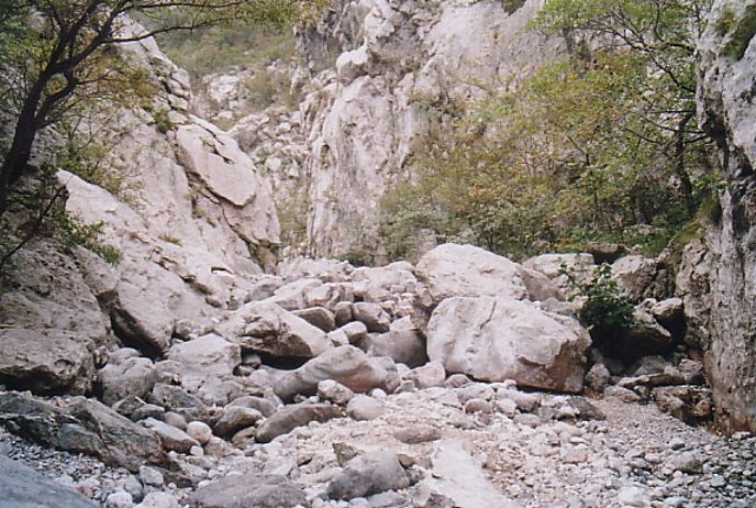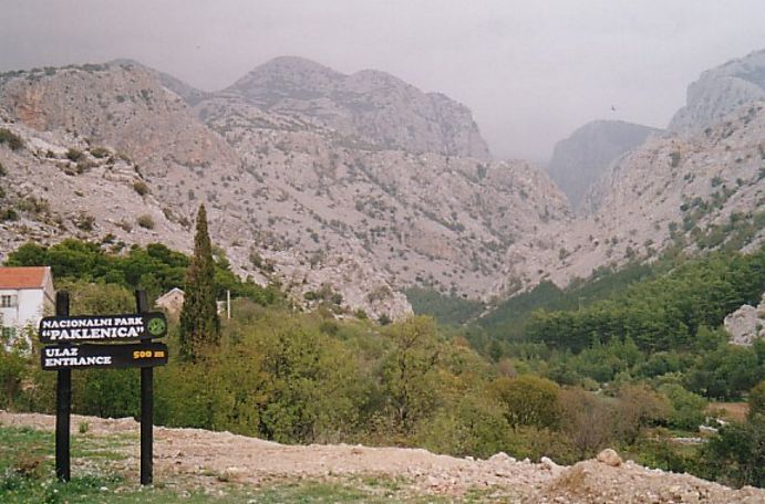 Sonntag, 10.10.2004 - Wanderung in den Schluchten des Nationalparks Parklenica Der Nationalpark Parklenica ist mit seinen zwei tiefen Schluchten und dem bis über 1700 m hohen Küstengebirge ein Eldorado für Kletterer und Naturfreunde. Die Kletterer sehen wir am nächsten Morgen bei unserer Wanderung in die Velika Paklenica in Massen. Überall klirren die Haken und Eisen, was mag hier wohl in der Hauptsaison los sein? Wir wollen auf die konventionelle Art per Pedes die große und kleine Schlucht erlaufen. Von Anfangs mehr als perfekt ausgebauten Wegen geht es von der Velika Parklenica bald rechts ab in engen Kehren nach oben. Auf dem Hochplateau gelangen war zu einem einsamen Gehöft und machen Brotzeit. Faszinierend ist hier auch wieder die "unübersichtliche Landschaft", dank vieler Büsche und kleiner Felsen kann man nicht weit schauen. Laut Reiseführer führt der anspruchsvollere Teil der Wanderung durch die Mala Paklenica ("nur bei trockenem Wetter empfohlen"). Vom Hochplateau geht's es anfangs relativ einfach nach unten in die kleine Schlucht und weiter durchs Bachbett. Nach der Begegnung mit der obligatorischen Schlange werden die Steine immer größer und easy ist nicht mehr der richtige Ausdruck. Der einsetzende Regen macht die Felsen schön schmierig und auf dem Hosenboden rutschend "kämpfen" wir uns Richtung Küste. Zum Glück sind wir nach unten unterwegs - bei Regen hoch macht es sicher wenig Spaß, und bei richtig Wasser im Bach hat man kaum eine Chance. Gut durchnässt genießen wir am Abend die Infrastruktur des Zeltplatzes und lassen den Tag bei ein, zwei "Karlovacko" ausklingen. Der Regen hört auch Nachts nicht auf, drum quartiert sich auch der "kleine Petz" des Zeltplatzes in unserem "Vorzelt" ein. Zum Beinchen heben verschwindet er vorbildlich von unserer Reisetasche, kehrt aber danach ins trockene Zelt zurück. Erst als er nichts vom Frühstück abbekommt (er ist dick genug...) zieht er zum nächsten Camper weiter. |