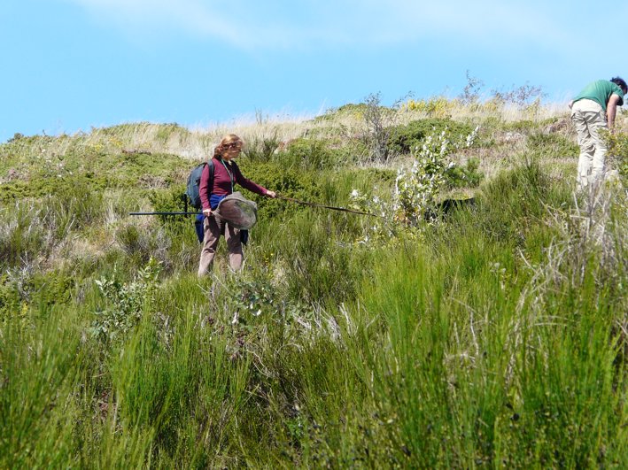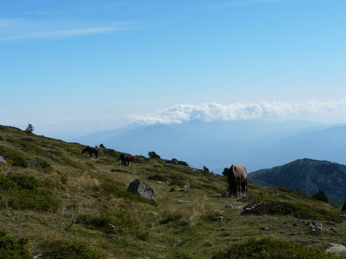 | Bei Sonne, aber echt kühlem Wind, wandern wir vorbei an halbwilden Pferden zum Turm de Batere. Hier beobachten wir andere „Kescher“ beim Insektenfangen. Zurück in unserer Herberge hält es uns nicht lange und wir fahren ins Tal. Hinter Corsavy probieren wir eine Creperie aus, aber auch hier vereitelt der Wind entspanntes draußen sitzen. Wie wir später noch erfahren werden, hatten wir in den Bergen noch Glück, denn an der Küste wehte ein ausgewachsener Sandsturm. |