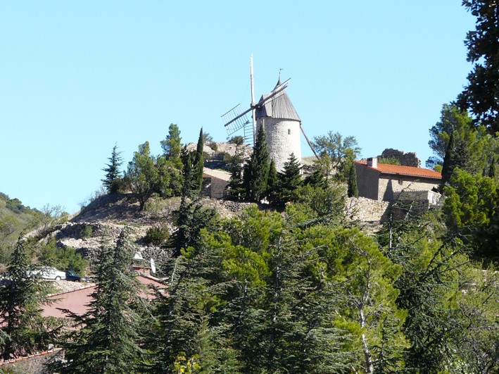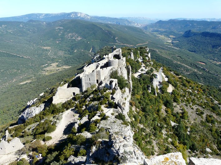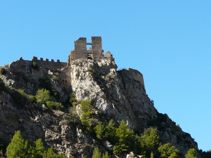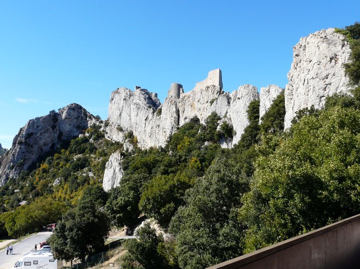 | Am nächsten Morgen ist wieder alles in Butter, genau der richtige Zeitpunkt um in Richtung der Kathargerburgen zu starten. Das Chateu d' Augilar liegt etwas abseits der Hauptströme und wie bei den folgenden Chateua de Padern und Chateau de Queribus begnügen wir uns mit der Außenansicht. Mittag machen wir am Rande eines Feldweges mit perfekter Sicht auf das Chateau de Peyrepertuse. |